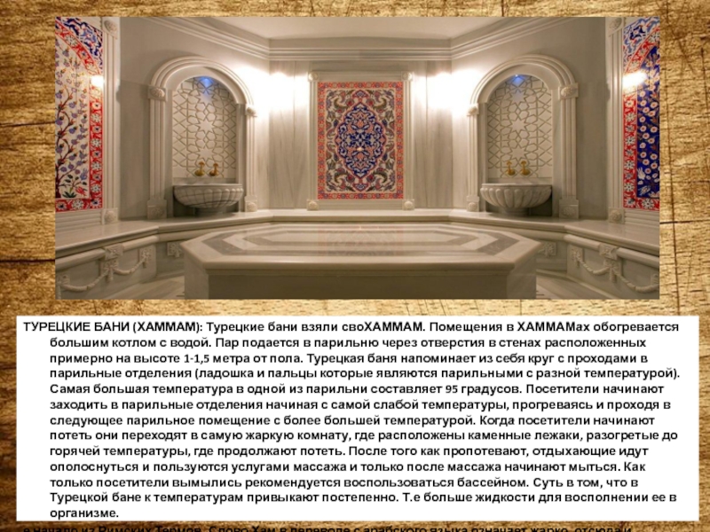 Слайд 19ТУРЕЦКИЕ БАНИ (ХАММАМ): Турецкие бани взяли своХАММАМ. Помещения в ХАММАМах обогревается большим