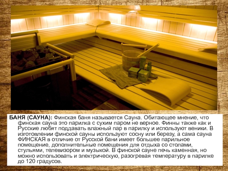 Слайд 17БАНЯ (САУНА): Финская баня называется Сауна. Обитающее мнение, что финская сауна это