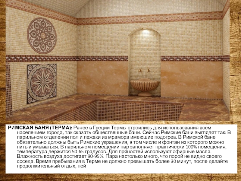 города, так сказать общественные бани. Сейчас Римские бани выглядят так: В парильном отделении пол и лежаки из мрамора имеющие подогрев. В Римской бане обязательно должны быть Римские украшения, в том числе и фонтан из которого можно пить и умываться. В парильном помещении пар заполняет практически 100% помещения, температура держится 50-65 градусов. Для пряностей используют эфирные масла. Влажность воздуха достигает 90-95%. Пара настолько много, что порой не видно своего соседа. Время пребывания в Терме не должно превышать более 30 минут, после делайте продолжительный отдых, пей