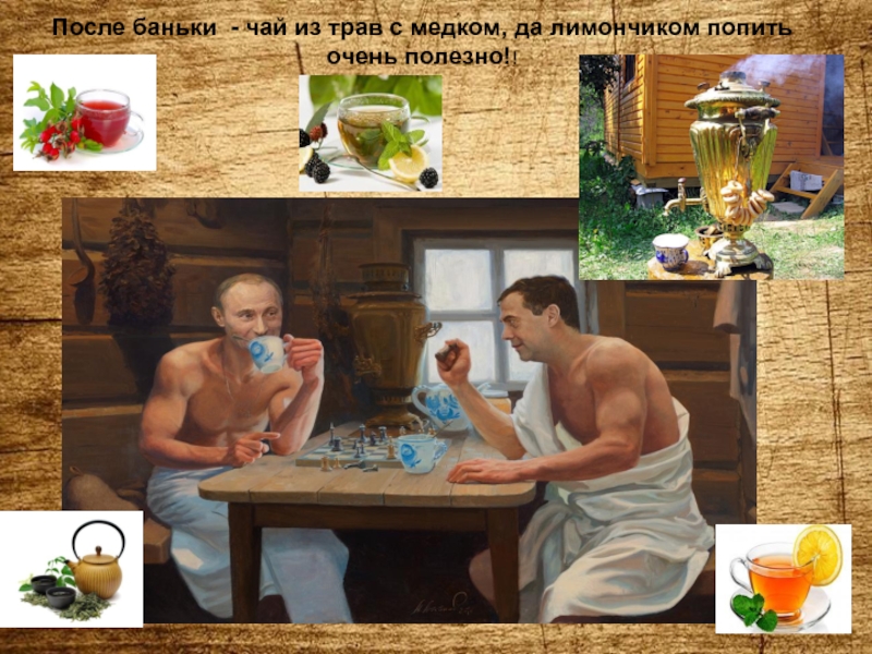 Слайд 14После баньки - чай из трав с медком, да лимончиком попить