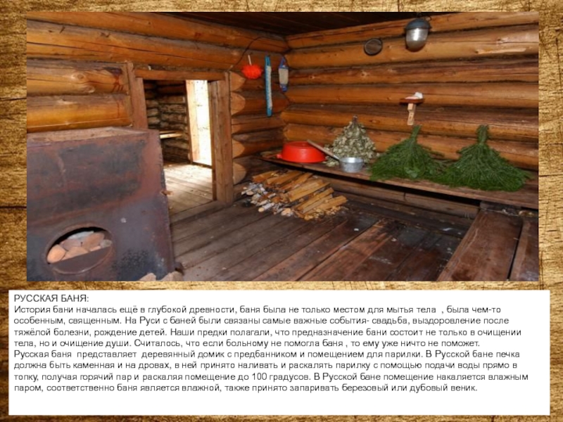 только местом для мытья тела , была чем-то особенным, священным. На Руси с баней были связаны самые важные события- свадьба, выздоровление после тяжёлой болезни, рождение детей. Наши предки полагали, что предназначение бани состоит не только в очищении тела, но и очищение души. Считалось, что если больному не помогла баня , то ему уже ничто не поможет.