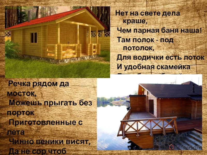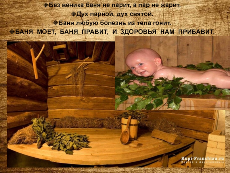 БАНЯ МОЕТ, БАНЯ ПРАВИТ, И ЗДОРОВЬЯ НАМ ПРИБАВИТ.