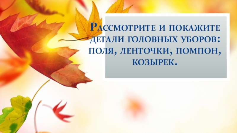 Слайд 4Рассмотрите и покажите детали головных уборов: поля, ленточки, помпон, козырек.
