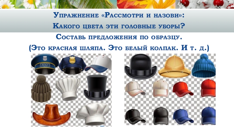 Слайд 7Упражнение «Рассмотри и назови»: Какого цвета эти головные уборы? Составь пред­ложения