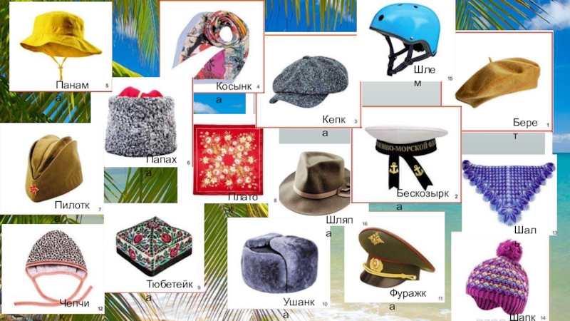 БеретБескозыркаКепкаКосынкаПанамаПапахаПилоткаПлатокТюбетейкаУшанкаФуражкаЧепчикШальШапкаШлемШляпа
