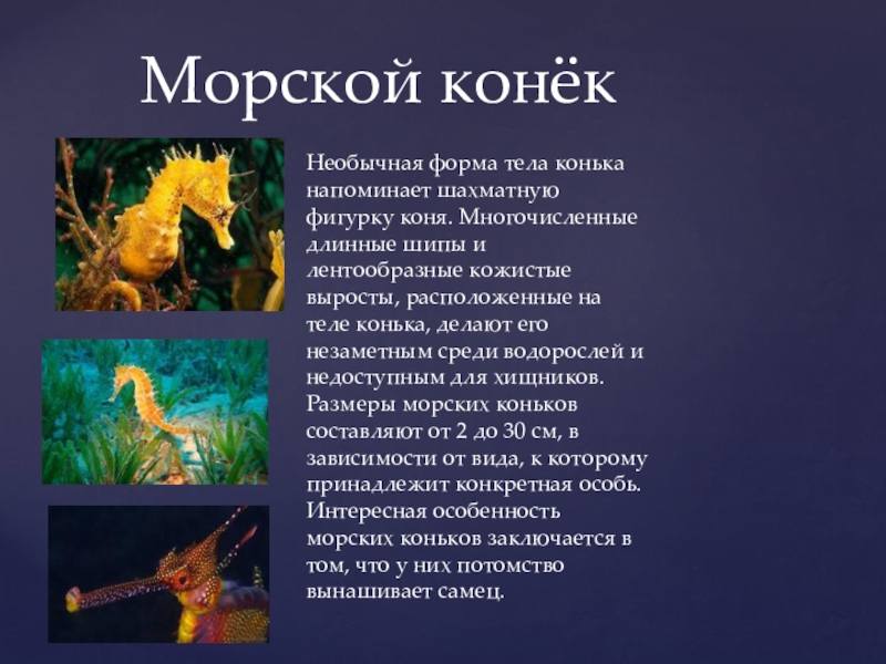 и лентообразные кожистые выросты, расположенные на теле конька, делают его незаметным среди водорослей и недоступным для хищников. Размеры морских коньков составляют от 2 до 30 см, в зависимости от вида, к которому принадлежит конкретная особь. Интересная особенность морских коньков заключается в том, что у них потомство вынашивает самец.