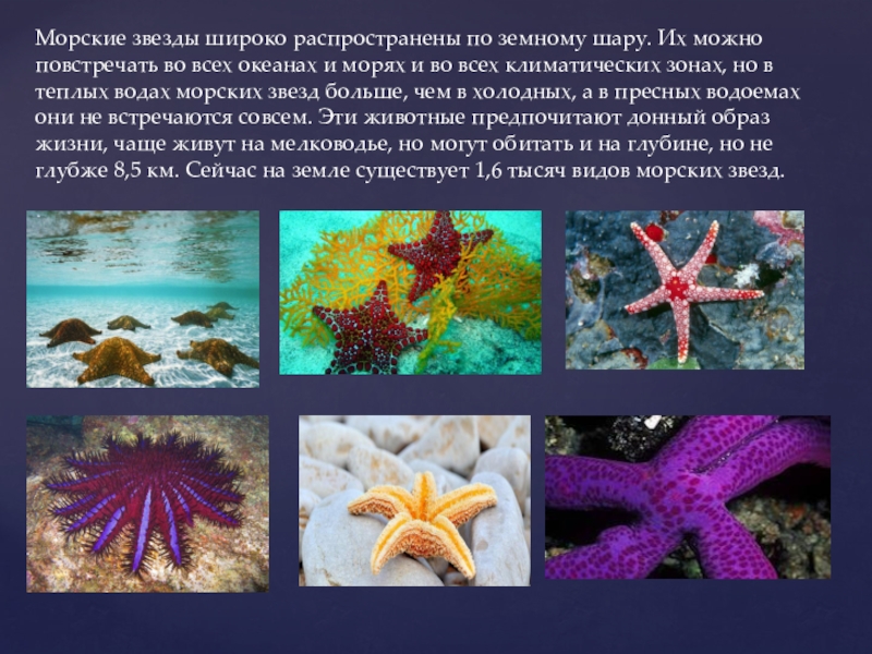 всех океанах и морях и во всех климатических зонах, но в теплых водах морских звезд больше, чем в холодных, а в пресных водоемах они не встречаются совсем. Эти животные предпочитают донный образ жизни, чаще живут на мелководье, но могут обитать и на глубине, но не глубже 8,5 км. Сейчас на земле существует 1,6 тысяч видов морских звезд.