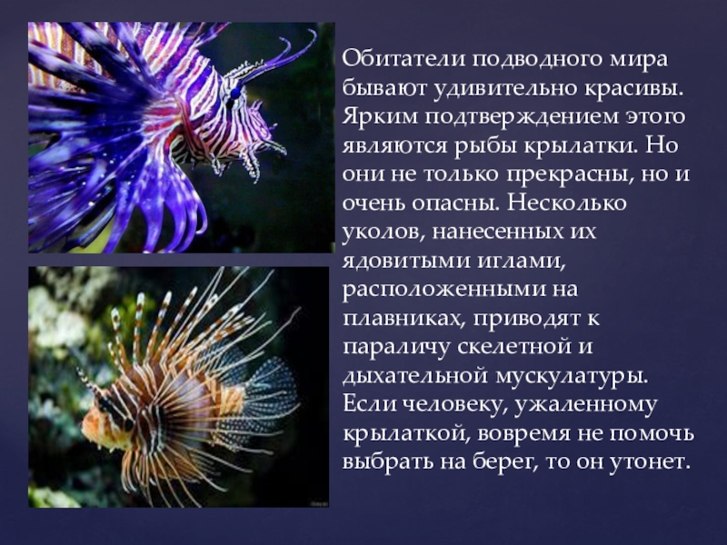 крылатки. Но они не только прекрасны, но и очень опасны. Несколько уколов, нанесенных их ядовитыми иглами, расположенными на плавниках, приводят к параличу скелетной и дыхательной мускулатуры. Если человеку, ужаленному крылаткой, вовремя не помочь выбрать на берег, то он утонет.