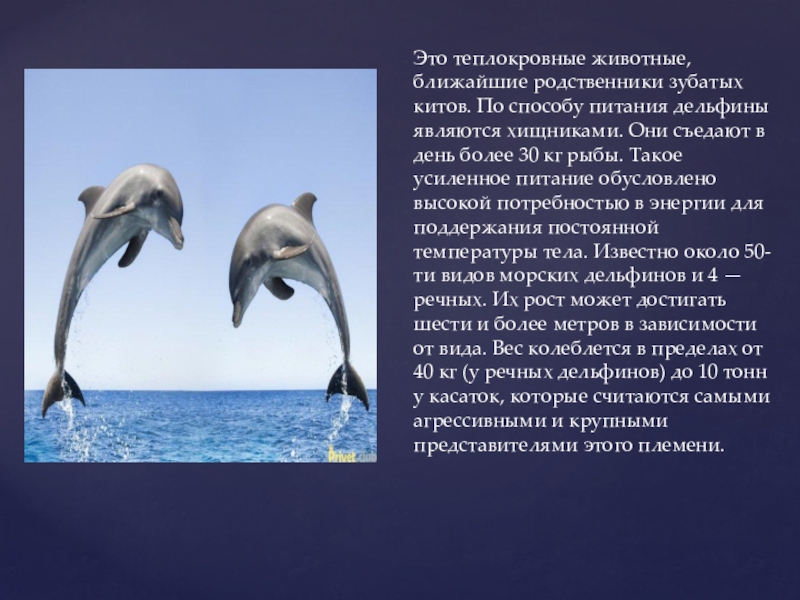 являются хищниками. Они съедают в день более 30 кг рыбы. Такое усиленное питание обусловлено высокой потребностью в энергии для поддержания постоянной температуры тела. Известно около 50-ти видов морских дельфинов и 4 — речных. Их рост может достигать шести и более метров в зависимости от вида. Вес колеблется в пределах от 40 кг (у речных дельфинов) до 10 тонн у касаток, которые считаются самыми агрессивными и крупными представителями этого племени.