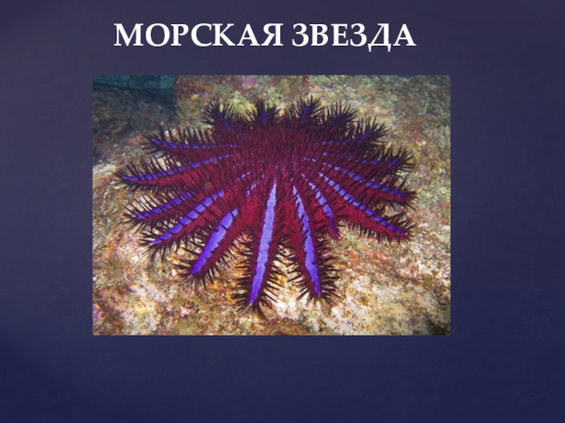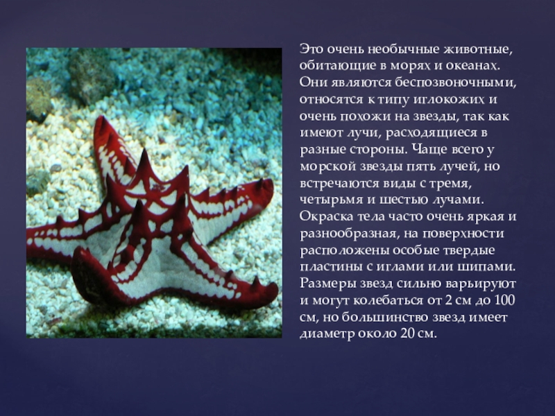 беспозвоночными, относятся к типу иглокожих и очень похожи на звезды, так как имеют лучи, расходящиеся в разные стороны. Чаще всего у морской звезды пять лучей, но встречаются виды с тремя, четырьмя и шестью лучами. Окраска тела часто очень яркая и разнообразная, на поверхности расположены особые твердые пластины с иглами или шипами. Размеры звезд сильно варьируют и могут колебаться от 2 см до 100 см, но большинство звезд имеет диаметр около 20 см.