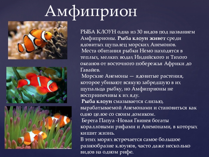 Морские Анемоны — ядовитые растения, которое убивают всякую забредшую в их щупальца рыбку, но Амфиприоны не восприимчивы к их яду.
