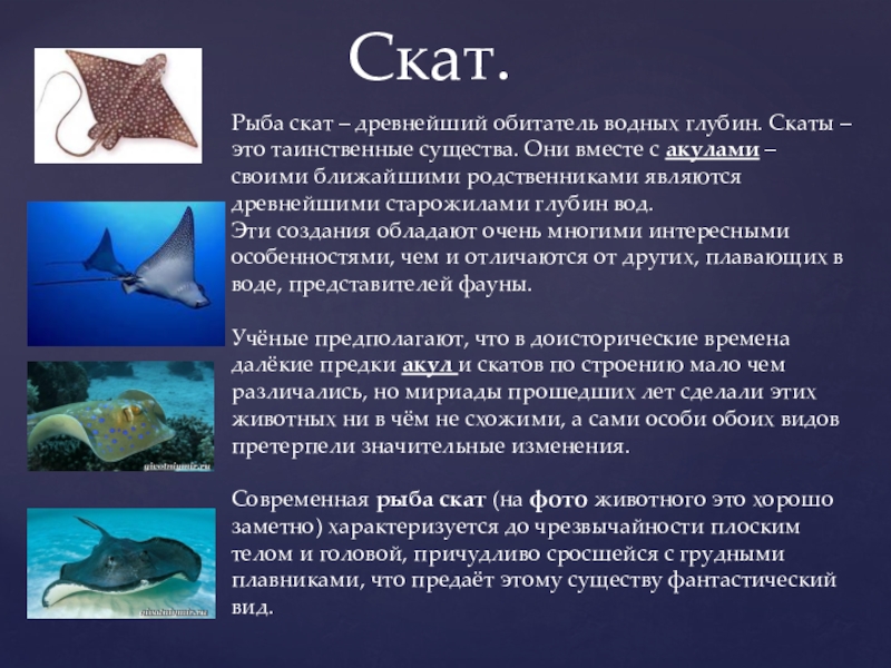 Рыба скат – древнейший обитатель водных глубин. Скаты – это таинственные