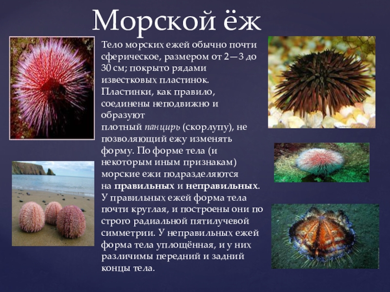 30 см; покрыто рядами известковых пластинок. Пластинки, как правило, соединены неподвижно и образуют плотный панцирь (скорлупу), не позволяющий ежу изменять форму. По форме тела (и некоторым иным признакам) морские ежи подразделяются на правильных и неправильных. У правильных ежей форма тела почти круглая, и построены они по строго радиальной пятилучевой симметрии. У неправильных ежей форма тела уплощённая, и у них различимы передний и задний концы тела.