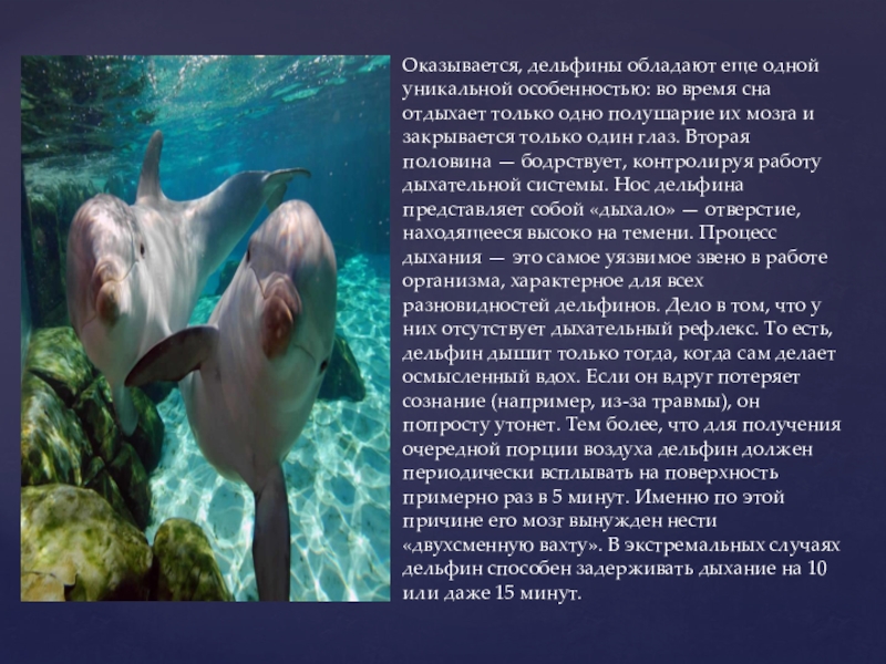 Слайд 6Оказывается, дельфины обладают еще одной уникальной особенностью: во время сна отдыхает