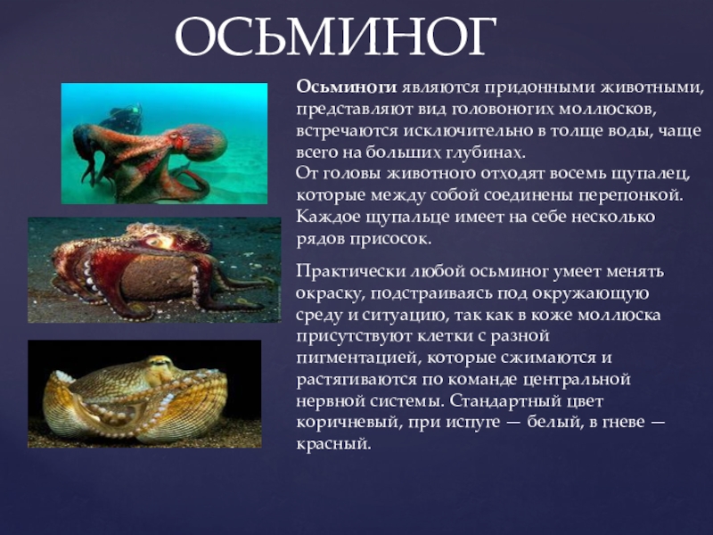 Осьминоги являются придонными животными, представляют вид головоногих моллюсков, встречаются исключительно в толще