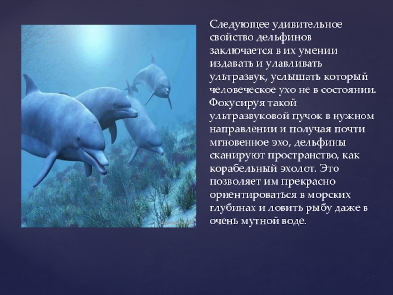 Слайд 5Следующее удивительное свойство дельфинов заключается в их умении издавать и улавливать