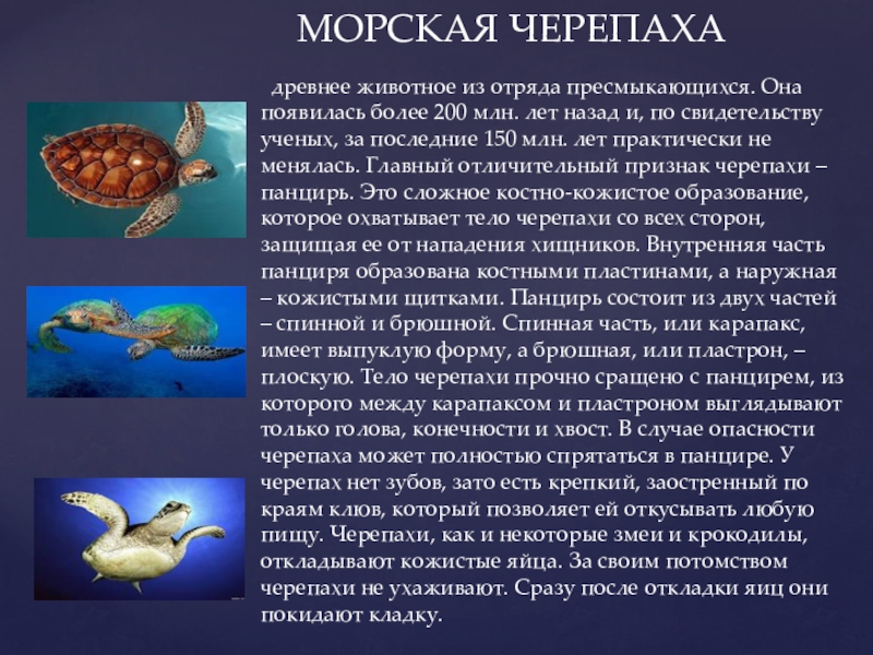 лет назад и, по свидетельству ученых, за последние 150 млн. лет практически не менялась. Главный отличительный признак черепахи – панцирь. Это сложное костно-кожистое образование, которое охватывает тело черепахи со всех сторон, защищая ее от нападения хищников. Внутренняя часть панциря образована костными пластинами, а наружная – кожистыми щитками. Панцирь состоит из двух частей – спинной и брюшной. Спинная часть, или карапакс, имеет выпуклую форму, а брюшная, или пластрон, – плоскую. Тело черепахи прочно сращено с панцирем, из которого между карапаксом и пластроном выглядывают только голова, конечности и хвост. В случае опасности черепаха может полностью спрятаться в панцире. У черепах нет зубов, зато есть крепкий, заостренный по краям клюв, который позволяет ей откусывать любую пищу. Черепахи, как и некоторые змеи и крокодилы, откладывают кожистые яйца. За своим потомством черепахи не ухаживают. Сразу после откладки яиц они покидают кладку.