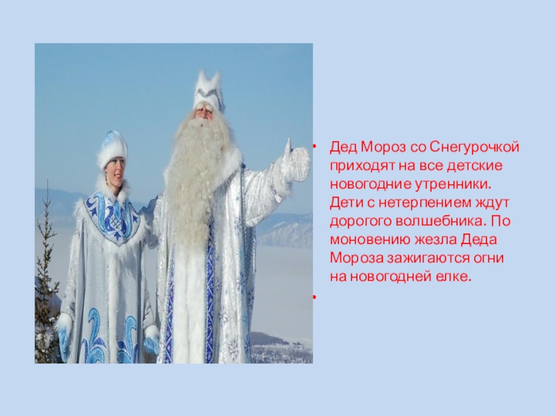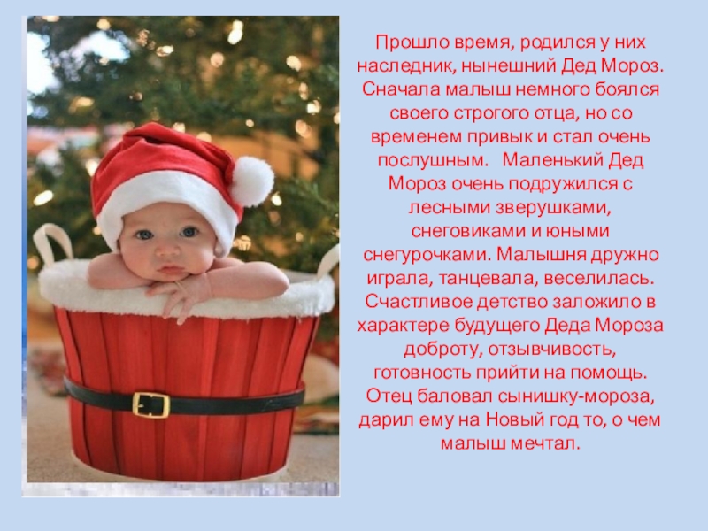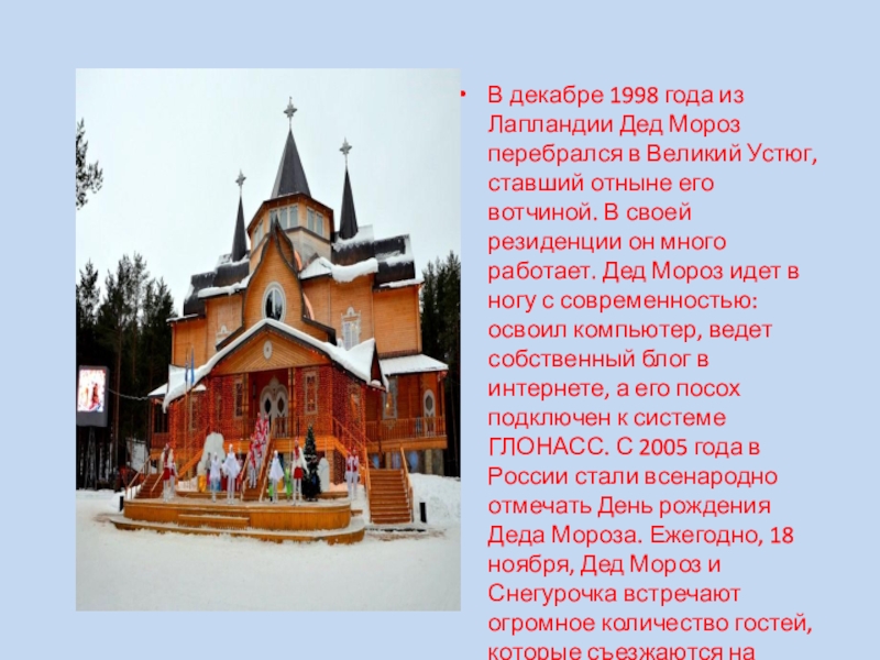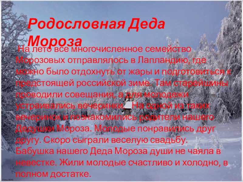 На лето все многочисленное семейство Морозовых отправлялось в Лапландию, где можно было отдохнуть от жары и подготовиться к предстоящей российской зиме. Там старейшины проводили совещания, а для молодежи устраивались вечеринки. На одной из таких вечеринок и познакомились родители нашего Дедушки Мороза. Молодые понравились друг другу. Скоро сыграли веселую свадьбу. Бабушка нашего Деда Мороза души не чаяла в невестке. Жили молодые счастливо и холодно, в полном достатке.