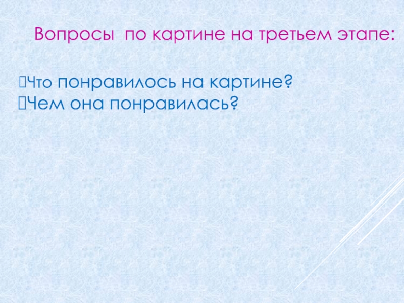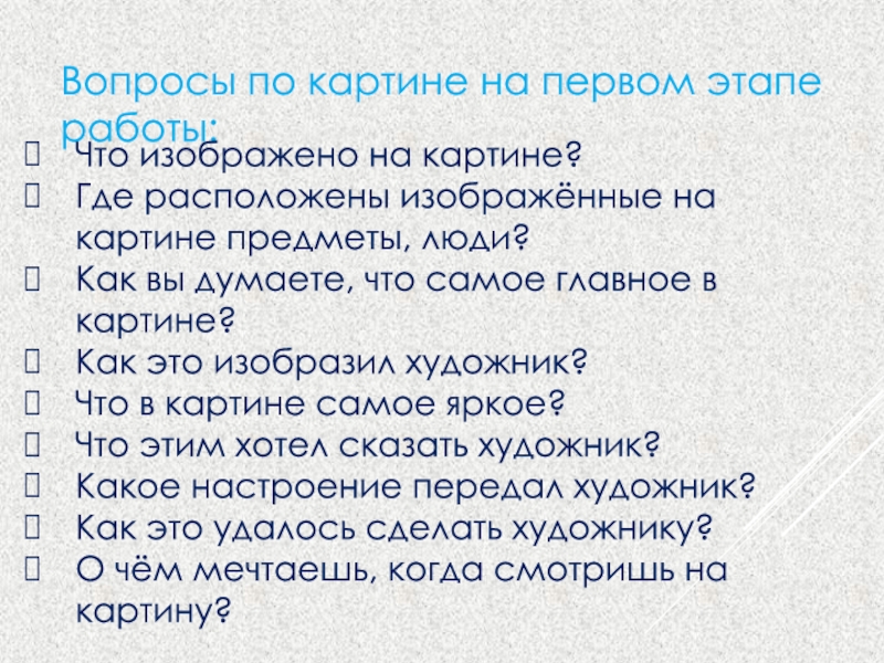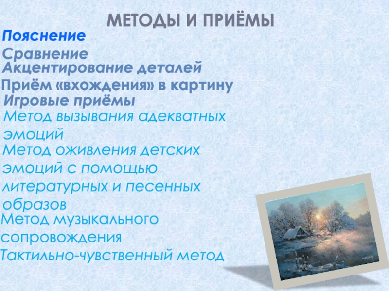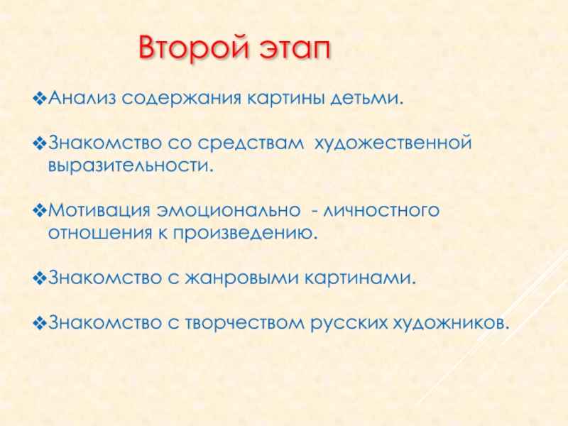 Вторая группа – изобразительно-выразительная. Педагог учит детей воспринимать и оценивать художественные средства, используемые живописцем (как он изобразил действующих лиц, выразил замысел, раскрыл содержание произведения).