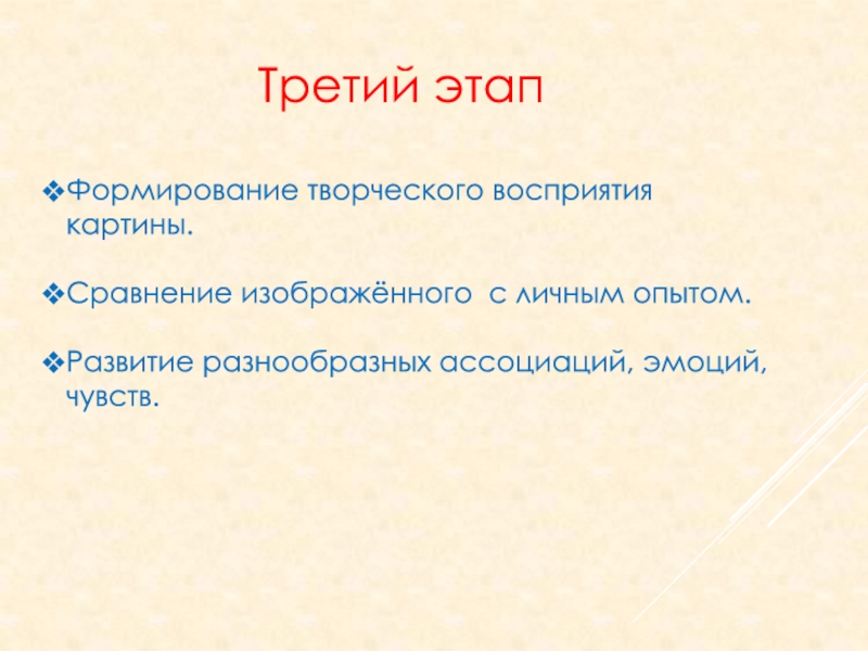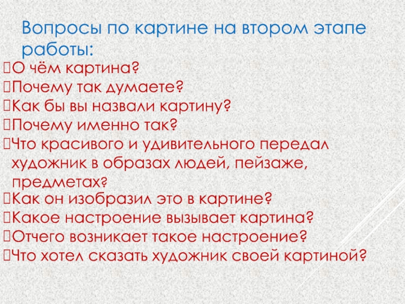 Третья группа – эмоционально-личностная. В неё входят задачи, решая которые воспитатель формирует у детей умение давать эстетическую оценку произведению. В этом ему могут помочь такие вопросы: «Каково отношение самого художника к замыслу?», «Что вам понравилось в картине?», «Какое она вызвала настроение?».