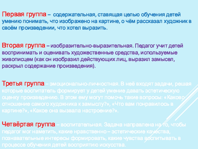 Четвёртая группа – воспитательная. Задача направлена на то, чтобы педагог мог наметить, какие нравственно – эстетические качества, познавательные интересы формировать, какие чувства воспитывать в процессе обучения детей восприятию искусства.