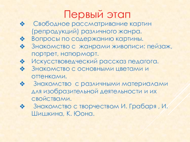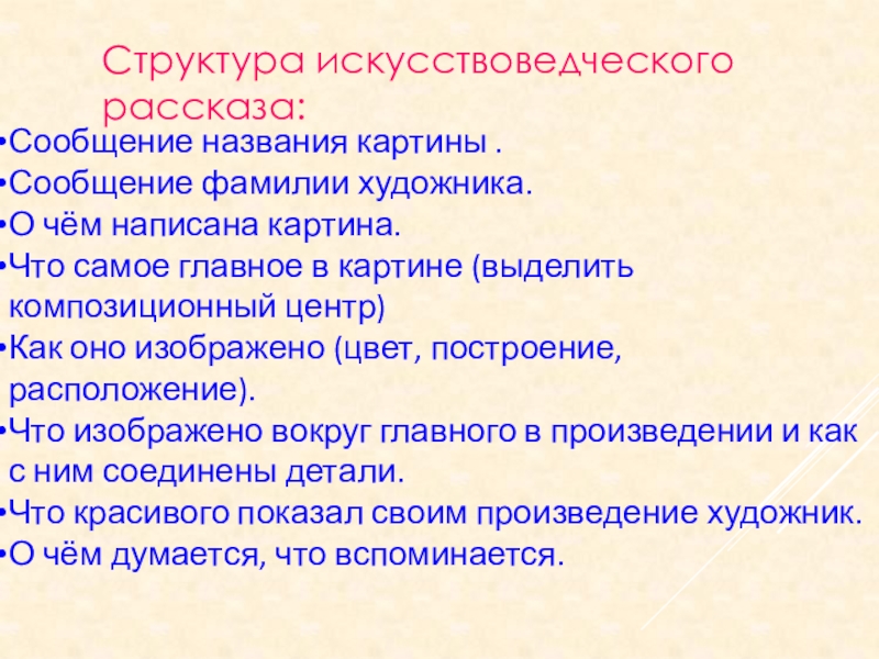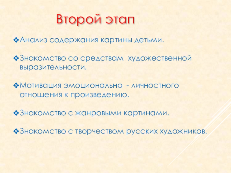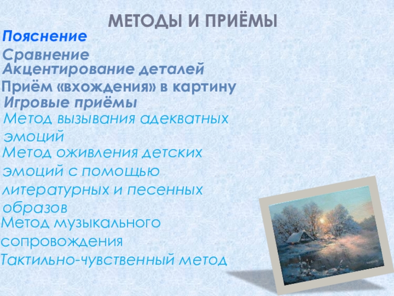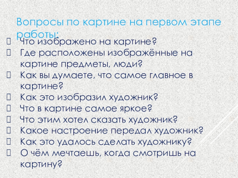 Вторая группа – изобразительно-выразительная. Педагог учит детей воспринимать и оценивать художественные средства, используемые живописцем (как он изобразил действующих лиц, выразил замысел, раскрыл содержание произведения).