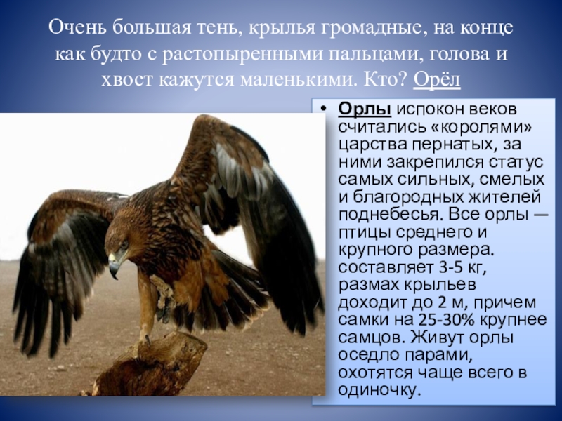 Орлы испокон веков считались «королями» царства пернатых, за ними закрепился статус самых сильных, смелых и благородных жителей поднебесья. Все орлы — птицы среднего и крупного размера. составляет 3-5 кг, размах крыльев доходит до 2 м, причем самки на 25-30% крупнее самцов. Живут орлы оседло парами, охотятся чаще всего в одиночку.