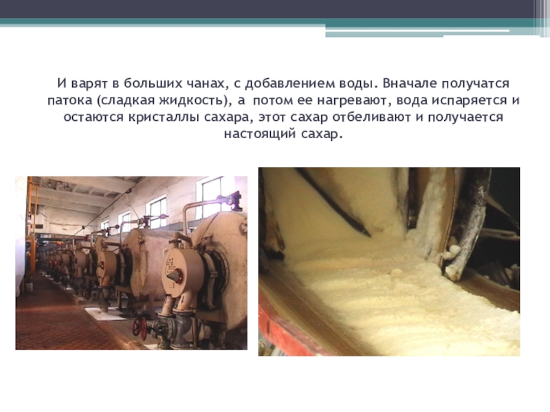 Слайд 7И варят в больших чанах, с добавлением воды. Вначале получатся патока