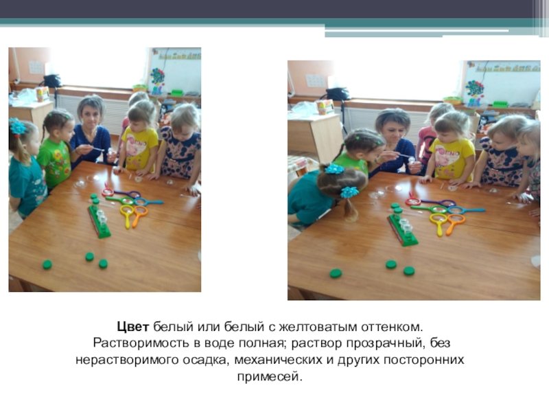 Цвет белый или белый с желтоватым оттенком. Растворимость в воде полная; раствор прозрачный, без нерастворимого осадка, механических и других