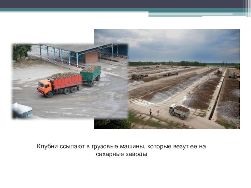 Слайд 5Клубни ссыпают в грузовые машины, которые везут ее на сахарные заводы