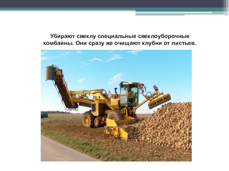 Слайд 4Убирают свеклу специальные свеклоуборочные комбайны. Они сразу же очищают клубни от