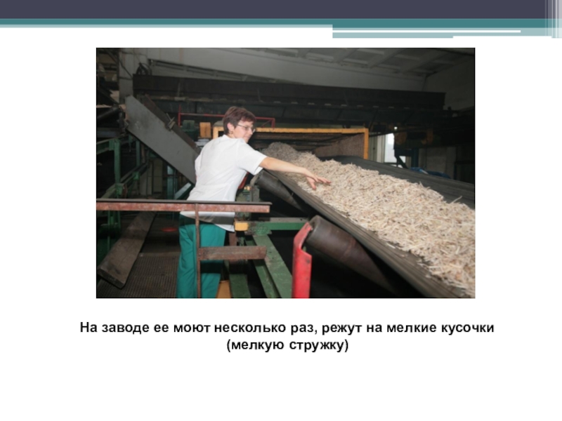 Слайд 6На заводе ее моют несколько раз, режут на мелкие кусочки (мелкую