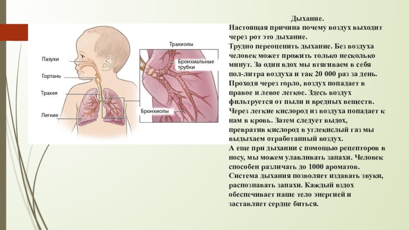 Система дыхания позволяет издавать звуки, распознавать запахи. Каждый вздох обеспечивает наше тело энергией и заставляет сердце биться.