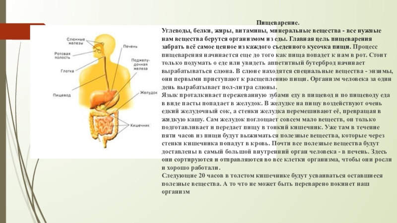 берутся организмом из еды. Главная цель пищеварения забрать всё самое ценное из каждого съеденного кусочка пищи. Процесс пищеварения начинается еще до того как пища попадет к нам в рот. Стоит только подумать о еде или увидеть аппетитный бутерброд начинает вырабатываться слюна. В слюне находятся специальные вещества - энзимы, они первыми приступают к расщеплению пищи. Организм человека за один день вырабатывает пол-литра слюны.