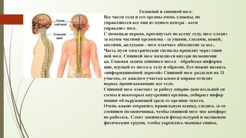 С помощью нервов, протянутых по всему телу, мозг следит за всеми частями организма - за ушами, глазами, кожей, костями, желудком - мозг отвечает абсолютно за все.. Часть пути электрические сигналы проходят через спинной мозг. Спинной мозг находятся внутри позвоночника. Главная задача спинного мозга – обработка информации, идущей от мозга к телу и обратно. Его можно назвать «информационной дорогой» Спинной мозг разделен на 31 участок, от каждого участка влево и вправо отходят нервы, пронизывающие все тело.