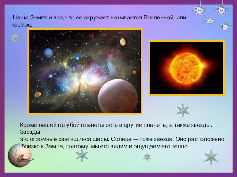 Наша Земля и все, что ее окружает называется Вселенной, или космос.