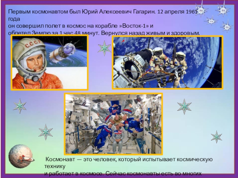 и работает в космосе. Сейчас космонавты есть во многих странах.