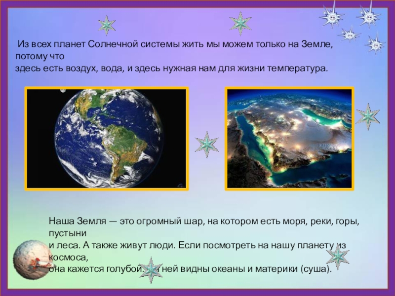 здесь есть воздух, вода, и здесь нужная нам для жизни температура.