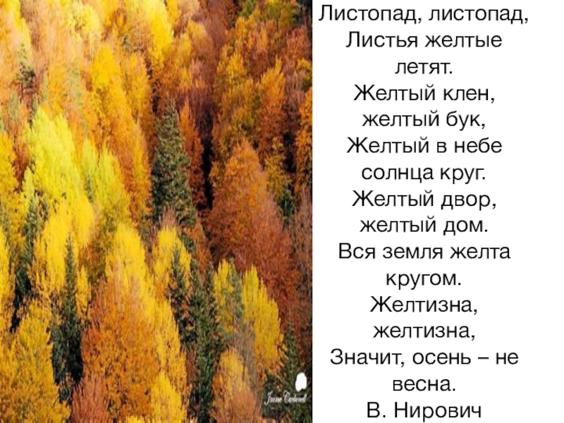 Листопад, листопад, Листья желтые летят. Желтый клен, желтый бук, Желтый в небе солнца круг. Желтый двор, желтый