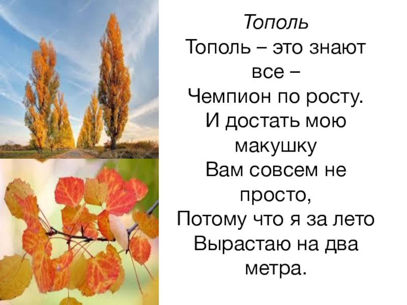 Тополь  Тополь – это знают все – Чемпион по росту. И достать мою макушку Вам совсем не