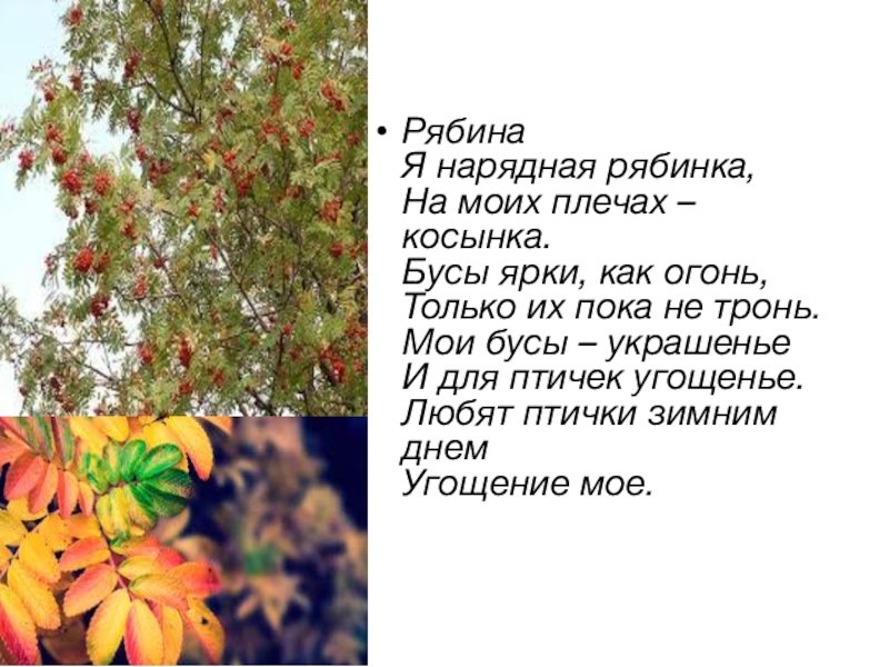 Слайд 7Рябина  Я нарядная рябинка, На моих плечах – косынка. Бусы ярки, как огонь,  Только их