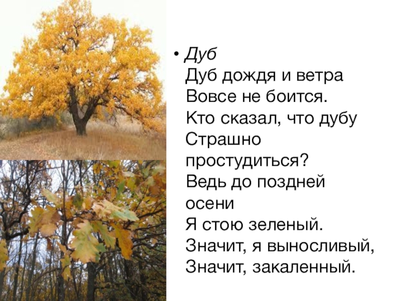 Дуб  Дуб дождя и ветра Вовсе не боится. Кто сказал, что дубу Страшно простудиться? Ведь до поздней