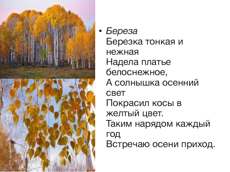 Береза Березка тонкая и нежная Надела платье белоснежное, А солнышка осенний свет Покрасил косы в желтый цвет.