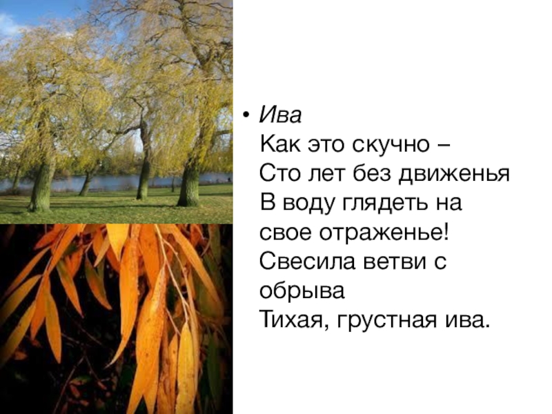 Ива Как это скучно – Сто лет без движенья В воду глядеть на свое отраженье! Свесила ветви