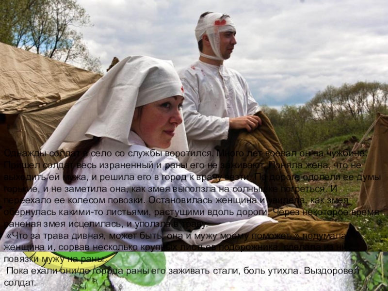 на чужбине. Пришел солдат весь израненный и раны его не заживают. Поняла жена, что не выходить ей мужа, и решила его в город к врачу везти. По дороге одолели ее думы горькие, и не заметила она, как змея выползла на солнышке погреться. И переехало ее колесом повозки. Остановилась женщина и увидела, как змея обернулась какими-то листьями, растущими вдоль дороги. Через некоторое время раненая змея исцелилась, и уползла в траву.