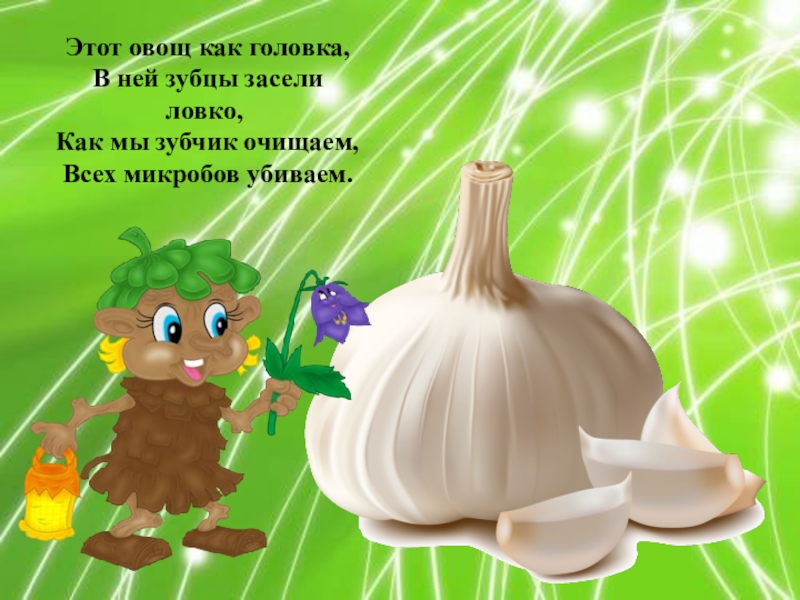 Этот овощ как головка,  В ней зубцы засели ловко,  Как мы зубчик очищаем,  Всех микробов убиваем.