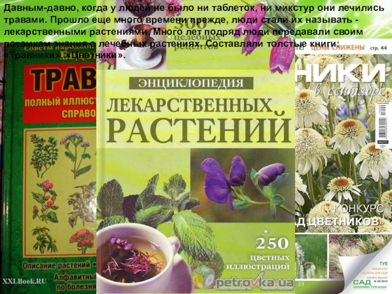 лечились травами. Прошло еще много времени прежде, люди стали их называть - лекарственными растениями. Много лет подряд люди передавали своим потомкам знания о лечебных растениях. Составляли толстые книги: «Травники», «Цветники».