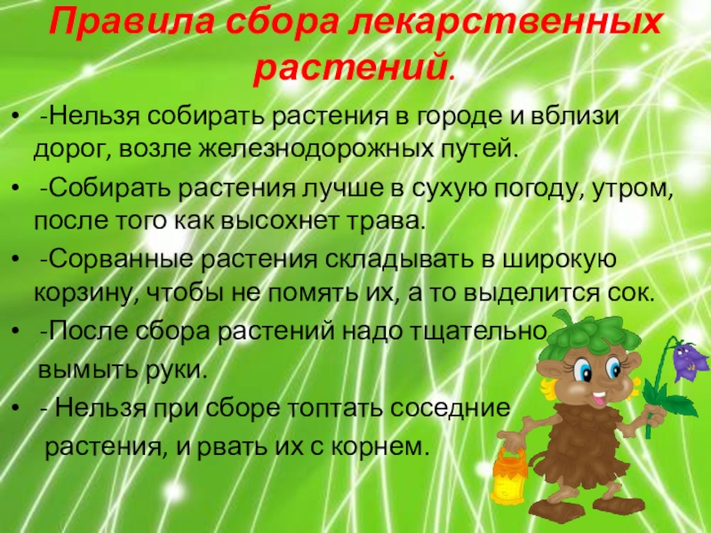 Правила сбора лекарственных растений.  -Нельзя собирать растения в городе и вблизи дорог, возле железнодорожных путей. -Собирать растения лучше