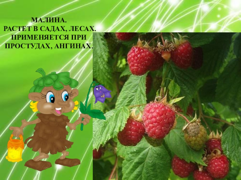 Слайд 12Малина. Растет в садах, лесах. Применяется при простудах, ангинах.