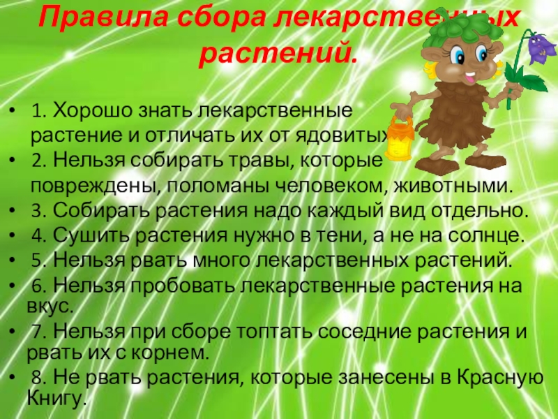 Правила сбора лекарственных растений.  1. Хорошо знать лекарственные   растение и отличать их от ядовитых. 2. Нельзя